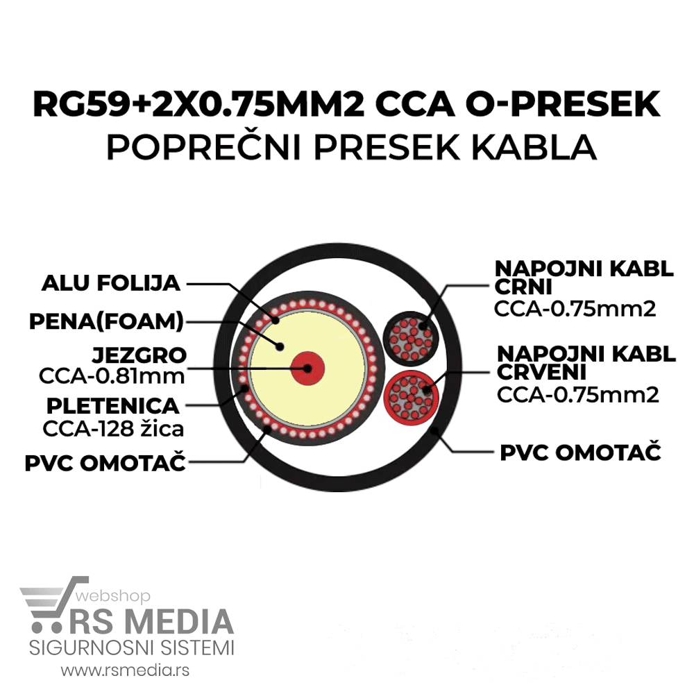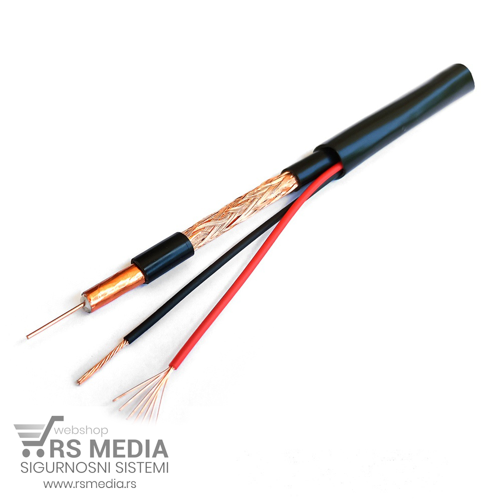 PRIKAZANA CENA JE ZA BUNT OD 300M. Koaksijalni kabl RG 59+napojni kabl 2×0.75 mm2, izuzetnog kvaliteta. Unutrašnje jezgro punog poprečnog preseka od legure bakra je idealnog prečnika od 0.81 mm. Zbog boljih izolacionih osobina, jezgro ovog kabla je izolovano penom, a sve zajedno obmotano aluminijumskom folijom. Pletenica (shirm) kod ovog kabla je 80% gustine što ga svrstava u sam vrh po kvalitetu među kablovima koji su dostupni na našem tržištu. Specifičnost ovog kabla je u tome što napajanje nije zalepljeno za koaksijalni deo već se napojni deo nalazi u omotaču koji obmotava ceo kabl zajedno. Prikazana slika je prava slika kabla. Ako želite da kupite isti ovakav kabl ali u većem pakovanju od 100m kliknite ovde. Više o artiklu možete pročitati sekciji u „Dodatne informacije“.