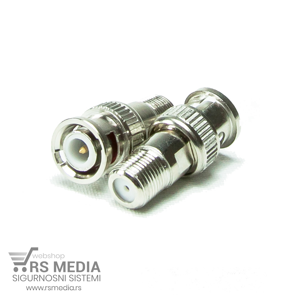 Konektor BNC muški za prenos video signala u sistemima video nadzora. Model “na F”. Za nameštanje konektora na koaksijalni kabal nije potreban dodatni alat. Za kompletan BNC konektor koji se može spojiti sa kablom potreban je i F konektor ili Kompresioni F konektor, bilo za RG59 ili RG6 kabl. Jedino u paru čini funkcionalnu celinu.