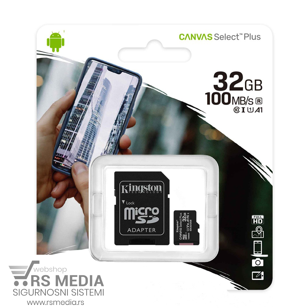 Memorijska kartica Kingston Canvas Select Plus 32GB, 100Mb/s. Kingston Canvas Select Plus microSD je kompatibilan sa Android uređajima i dizajniran je sa A1 performansama. Nudi poboljšanu brzinu i kapacitet za brže učitavanje aplikacija i snimanje slika i video zapisa u više kapaciteta do 512 GB. Moćan u performansama, brzini i izdržljivosti, Canvas Select Plus microSD je dizajniran za pouzdanost prilikom snimanja i razvijanja fotografija visoke rezolucije ili snimanja i uređivanja full HD video zapisa. Kingston Canvas kartice su testirane da budu izdržljive u najtežim okruženjima i uslovima, tako da možete da ih nosite bilo gde sa poverenjem da će vaše fotografije, video snimci i datoteke biti zaštićeni. Više o artiklu možete pročitati sekciji u „Dodatne informacije“.