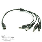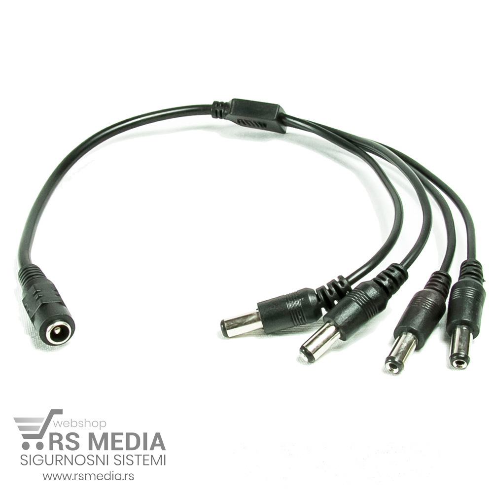 Razdelnik napajanja za video nadzor. Jedan ženski ulaz koji odgovara izlaznom kablu na ispravljaču se deli na četiri muška izlaza od kojih se svaki povezuje za kablom za napajanje kamera. Razdelnik služi da sa jednim ispravljačem napajate više kamera umesto da svaka kamera ima svoje napajanje. Takođe moguće je jedan ispravljač povezati sa DVR sistemom i određenim brojem kamera i tako uštedite na broju utičnica. Više o artiklu možete pročitati sekciji u „Dodatne informacije“.